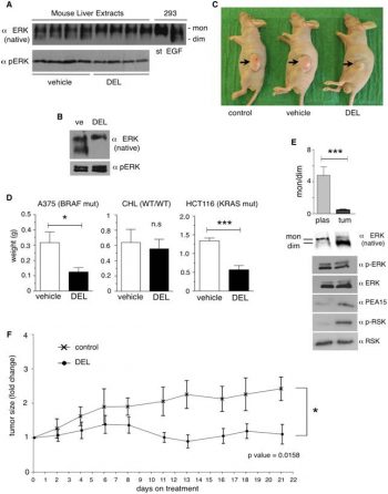 | In Vivo | DEL-22379 (15 mg/kg, i.p.) prevents tumor growth and metastasis in mice bearing A375 (BRAF mutant) and HCT116 (KRAS mutant) tumors, but fails to prevent the formation of tumors in mice injected with CHL cells (WT/WT). |