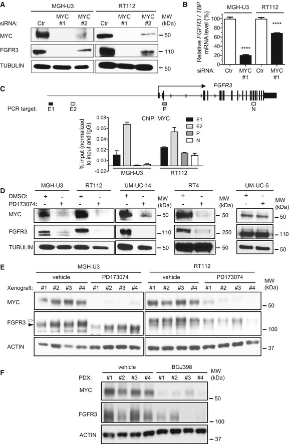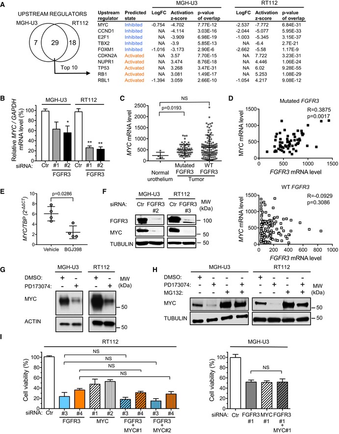The expression of MYC and FGFR3 was analyzed by Western blotting in lysates from MGH‐U3 and RT112 cells transfected for 72 h with MYC siRNAs.