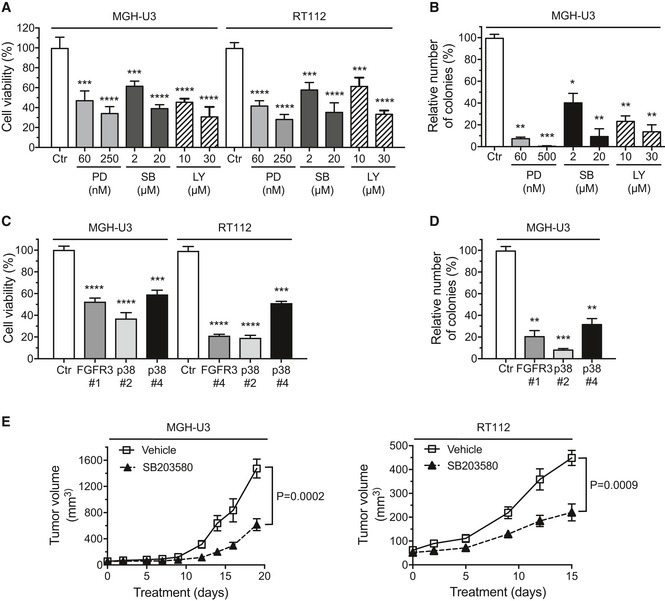 MGH‐U3 and RT112 cells were treated with control DMSO, PD [PD173074 (FGFR inhibitor)], SB [SB203580 (p38 inhibitor)] or LY [LY294002 (PI3 kinase inhibitor)] for 72 h and cell viability was then assessed by measuring MTT incorporation.