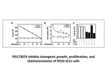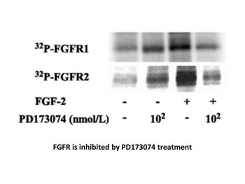 | In Vivo | Administration of PD173074 at 1 mg/kg/day or 2 mg/ka/day in mice can effectively block angiogenesis induced by either FGF or VEGF in a dose-dependent manner with no apparent toxicity. PD173074 inhibits in vivo growth of mutant FGFR3-transfected NIH 3T3 cells in nude mice. Inhibition of FGFR3 by PD173074 delays tumor growth and increases survival of mice in a KMS11 xenograft myeloma model. In the H-510 xenograft, oral aministration of PD173074 blocks tumor growth similar to that seen with single-agent cisplatin administration, increasing median survival compared with control sham-treated animals. In H-69 xenografts, PD173074 induces complete responses lasting>6 months in 50% of mice. These effects are correlated with increased apoptosis in excised tumors, but not a consequence of disrupted tumor vasculature. |