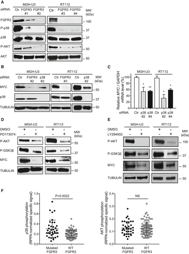 The MYC accumulation induced by activated FGFR3 is dependent on the activation of p38 and AKT.